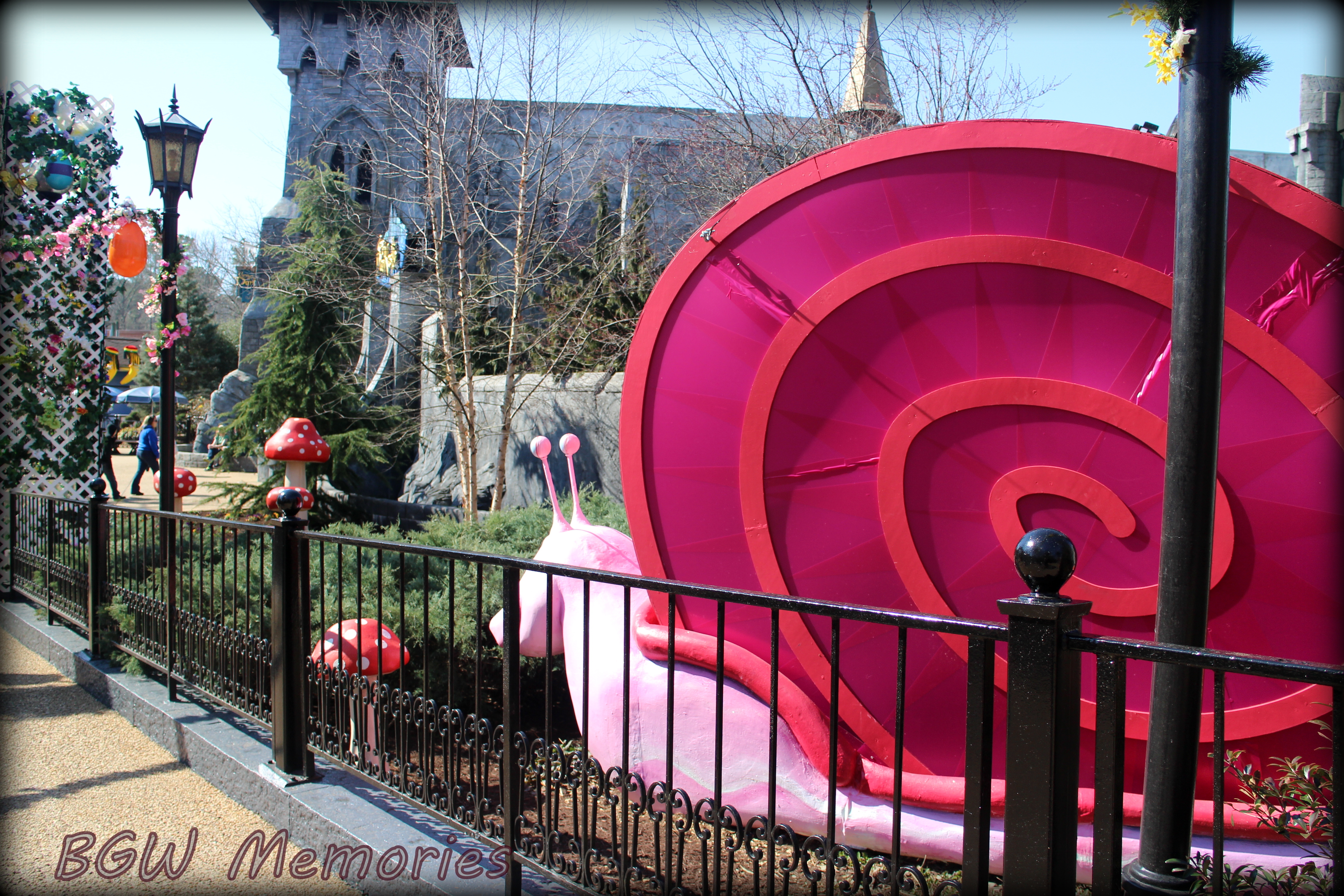 Heading towards Rhinefeld, the Bunny trail was up in all its glory. The interesting critters from Illuminights found their way on the Bunny Trail and also into the gardens near DarKastle. The snail (who many park enthusiasts have named “Oscar”), the ants, bees/lightening bugs, giant turtle, and frog are all there. Oscar the snail was missing his French chef hat and mustache and Mr. Frog was missing his top hat and monocle. Interesting, and I am not sure the purpose behind it all.