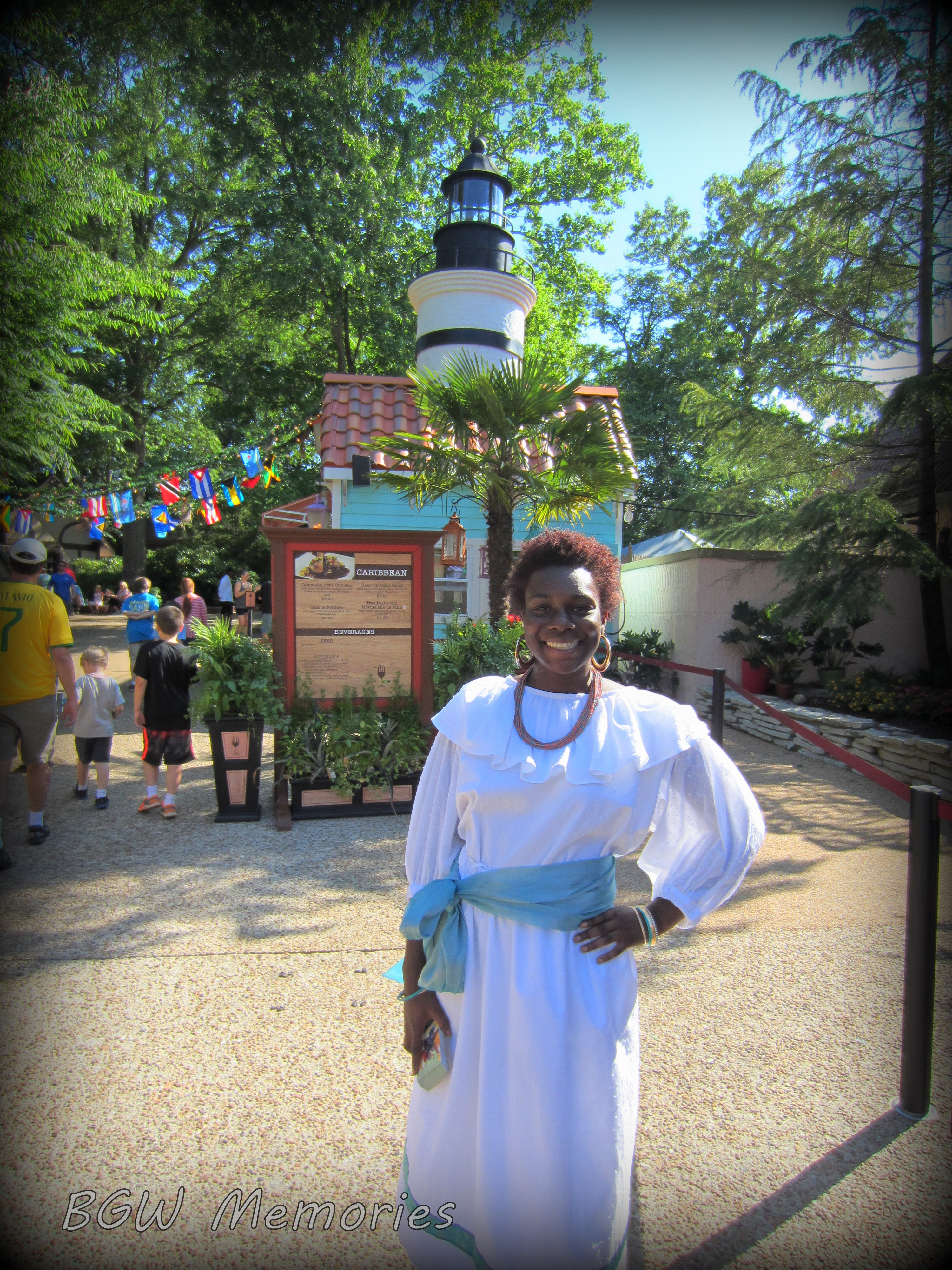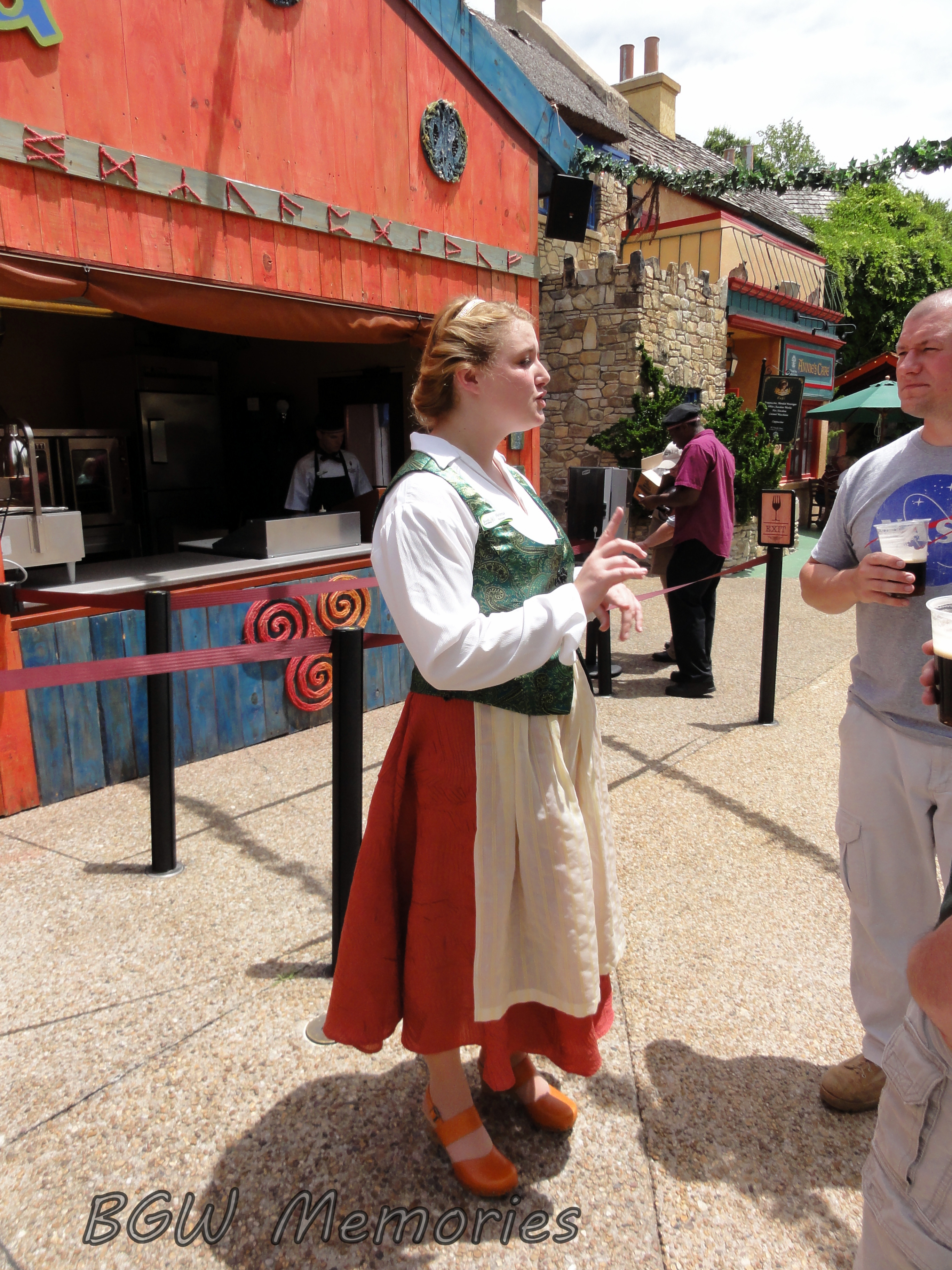 Costumed representatives of each country greet you at the entrance to each kiosk. Tara was the first to great me when I visited the Caribbean booth. Heather welcomes you in Scotland, Clara in France, and so forth. (I am still gathering photos and names of each individual. I will add them to this article once collected).